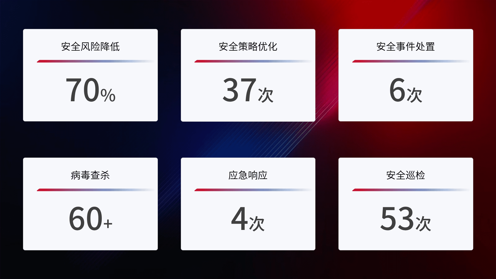 提供全面的安全事件报告体系,,,,包括处置报告、、、、周报、、、季度和年度总结,,,,结合持续监控,,,,帮助客户深入了解网络安全状况。。。