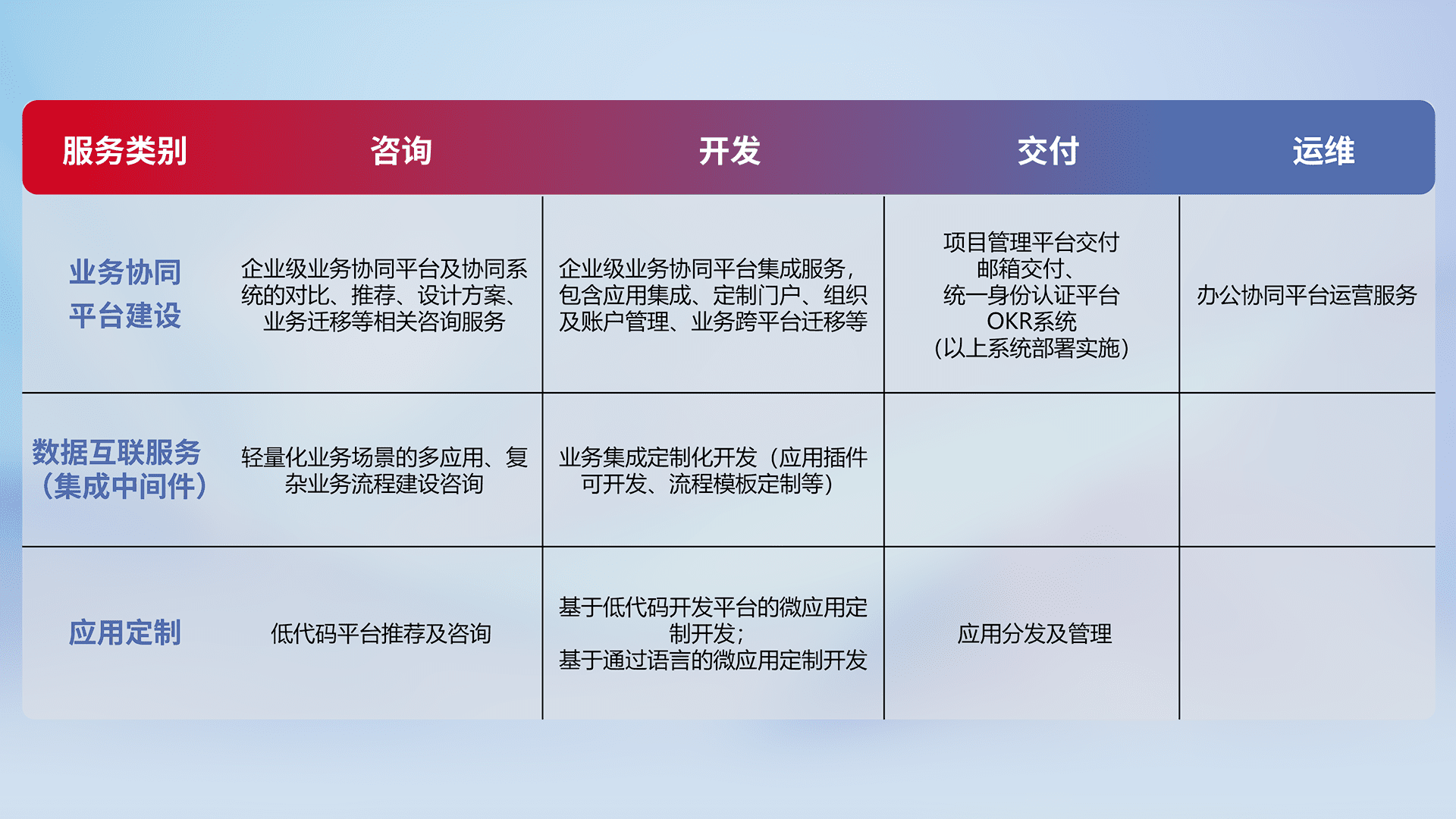 针对钉钉、、、企微、、IDaas等平台级产品提供产品的规划、、、、方案、、、交付、、、定制化开发等服务,,实现如统一协同办公、、、、智能客户服务、、、混合会议管理、、、智能数据查询、、、等业务场景,,,,实现数字化转型。。。。